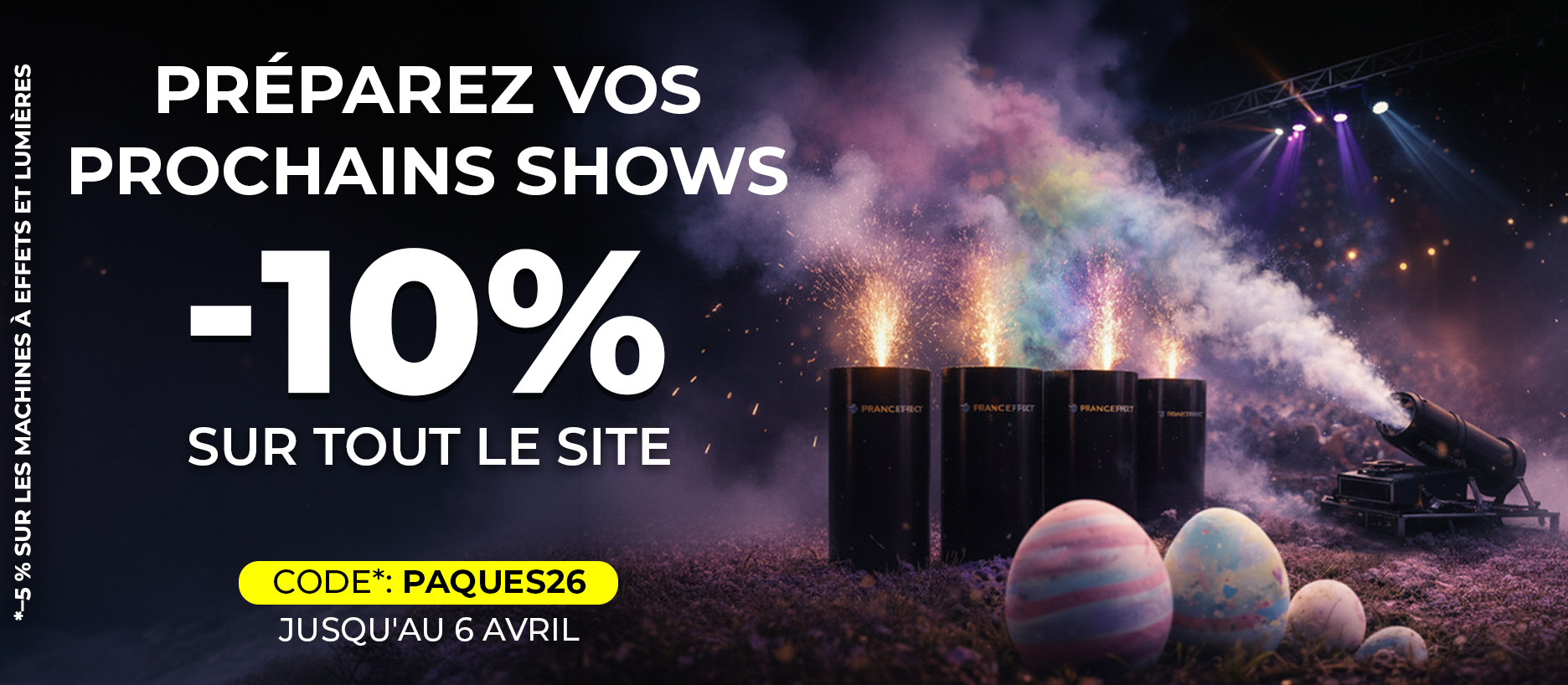 La boutique en ligne France Effect est spécialisée dans la vente de machine à effets spéciaux, de feux d'artifice, de consommables pour vos événements ainsi que la vente d’articles de fête.