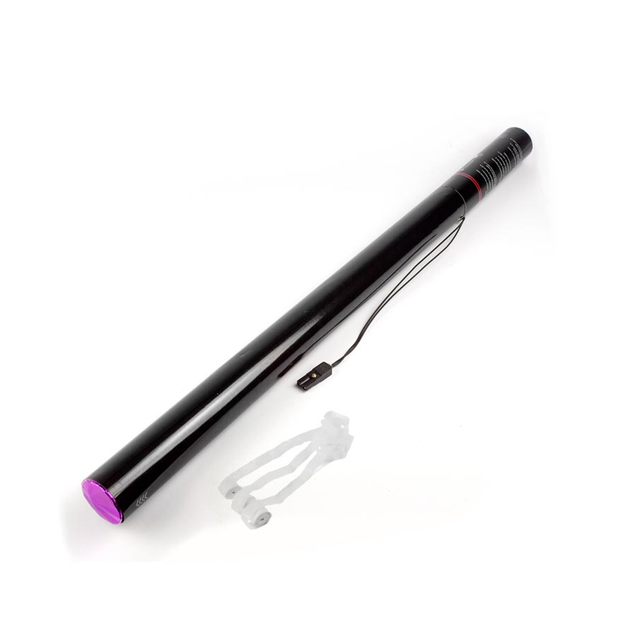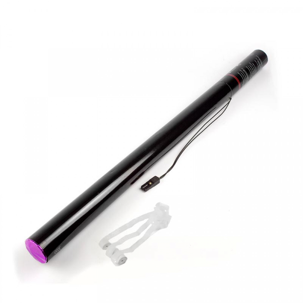 Le canon est complètement électrique, pour une projection avec un lanceur. Les confettis projetés sont multicolore en serpentins. La distance de projection est de 12 mètres.