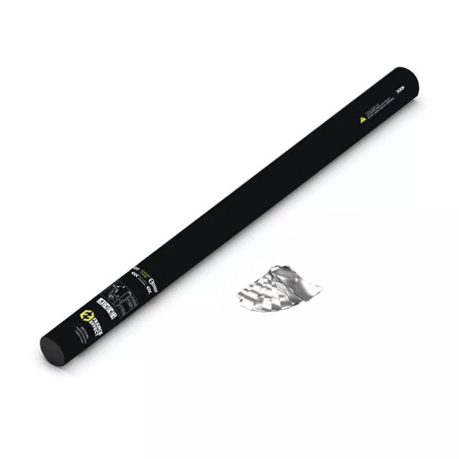 Canon à confettis manuel 80 cm argent métallisé. Portée jusqu’à 12 m, effet visuel premium. Idéal pour événements et animations.