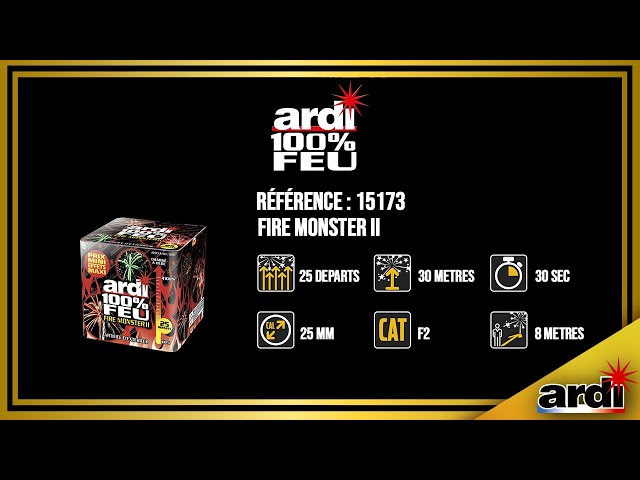 Le ARDI® 100% FEU - FIRE MONSTER II, un feu d’artifice Catégorie F2, promet un spectacle époustouflant de 30 secondes ! Avec ses 25 coups de feu concentrés grâce à son calibre de 25 mm, préparez-vous à être émerveillés.
