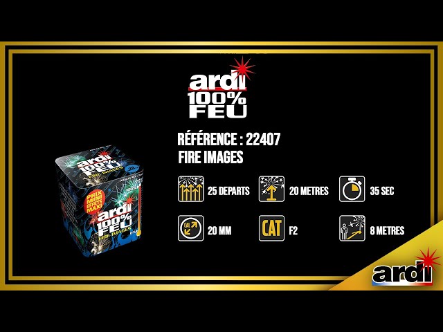 Découvrez le compact ARDI® 100% FEU - FIRE IMAGES, un artifice de Catégorie F2 qui fait partie de la célèbre Mad Fire Box®. En 35 secondes, il délivre 25 coups en calibre 20 mm, atteignant une hauteur impressionnante de 20 mètres.