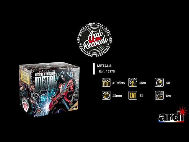 Préparez-vous à un spectacle pyrotechnique qui va vous en mettre plein les yeux avec le feu d’artifice compact ARDI® RECORDS METAL (Catégorie F2) ! Inspiré par l’énergie déchaînée du métal, ce show de 50 secondes vous en mettra plein la vue avec ses 31 coups de feu.