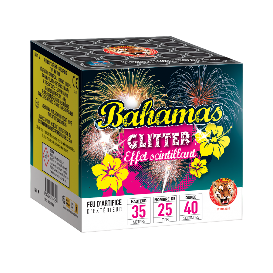 La gamme BAHAMAS® de la collection Le Tigre® vous promet un joli voyage visuel et sonore pour chacun des 4 feux d’artifice compacts qui la compose ! Voici notre "BAHAMAS GLITTER" et ses 25 coups scintillants qui illumineront le ciel avec une pointe de couleur bleue, rouge et or et son final sonore. Ce joli feu d'artifice fera pétiller intensément le ciel durant vos plus belles soirées festives !