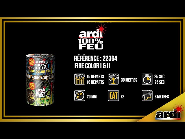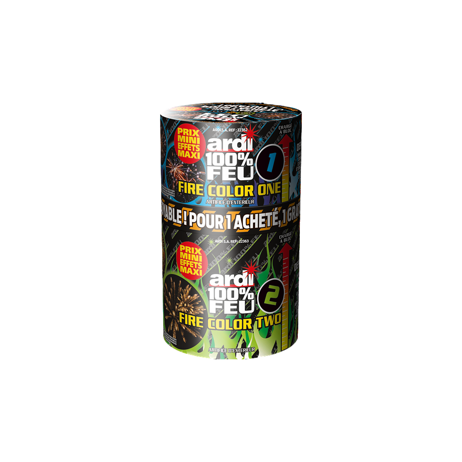 Les compacts FIRE COLOR 1 & 2 sont des artifices de Catégorie F2 qui promet un spectacle époustouflant. En 50 secondes, ils déploient 31 coups de feu de calibre 20 mm, atteignant des hauteurs impressionnantes de 30 mètres.