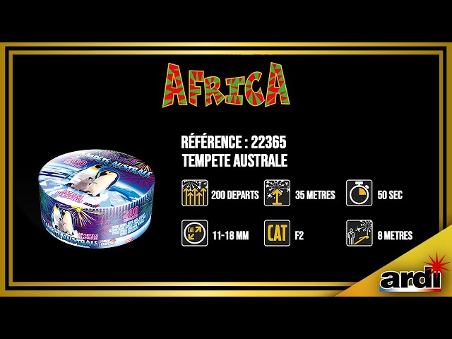 Découvrez le compact TEMPÊTE® AUSTRALE de notre gamme AFRICA® et préparez-vous à un spectacle pyrotechnique inoubliable ! Avec ses 200 départs, ce petit bijou promet une explosion d’effets sauvages, parfait pour un show pyro-animal ou pyro-africain.