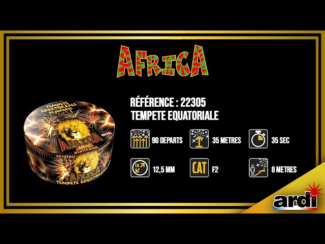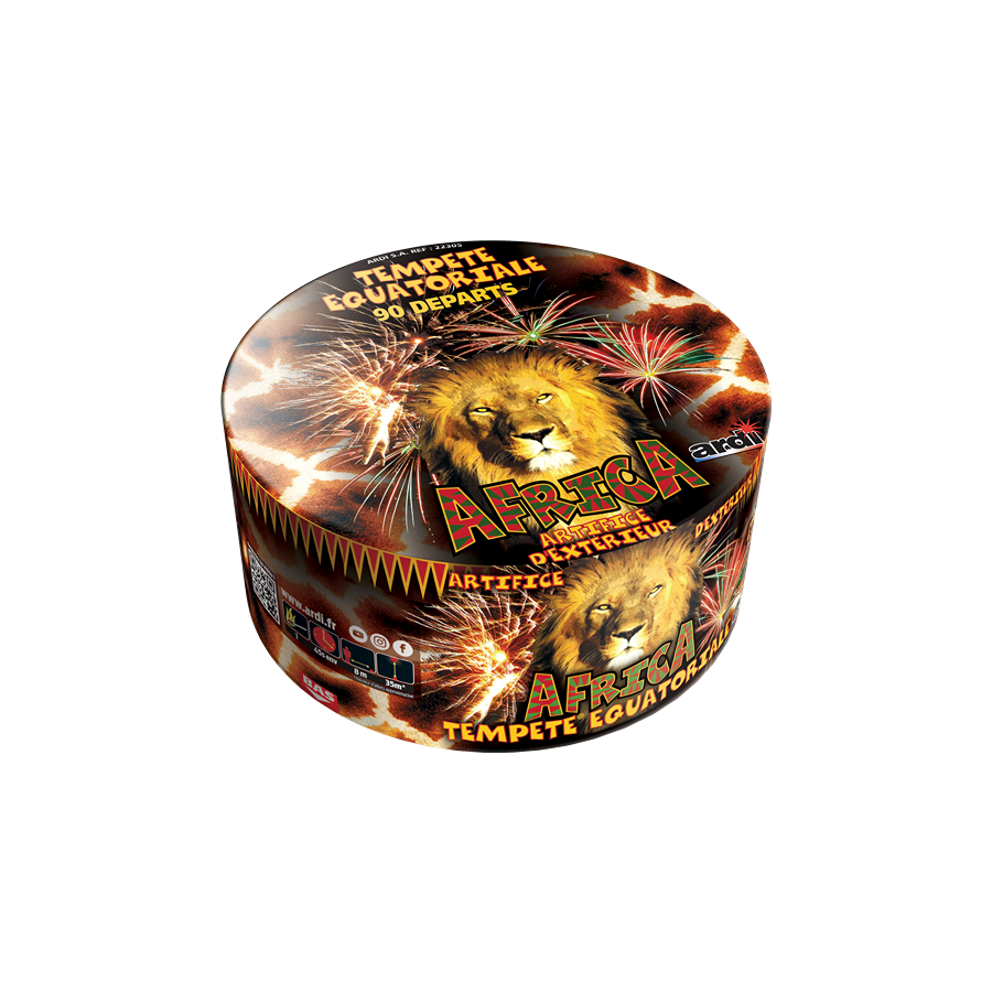 Avec ce compact TEMPÊTE® ÉQUATORIALE de notre gamme "AFRICA", offrez-vous un show pyro-animal ou pyro-africal. Effets sauvages garantis ! Allumez ce feu d'artifice compact et préparez-vous pour une véritable tempête d'effets pyrotechniques avec ses 90 départs !