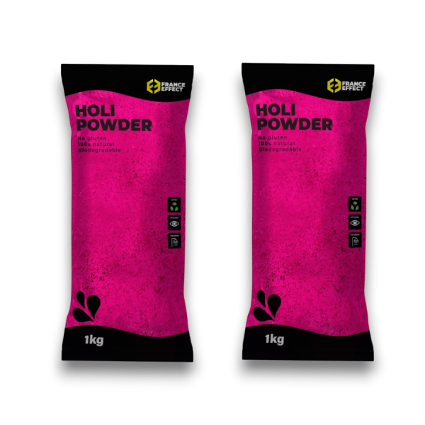 Chaque pack contient 2 sachets de poudre Holi de 1 kg chacun, pour un total de 2 kg. Ces poudres sont idéales pour des lancés festifs, des séances photo originales, ou encore pour décorer votre événement de manière élégante. Non toxiques et douces pour la peau, elles garantissent une expérience amusante et sécurisée pour tous les invités.